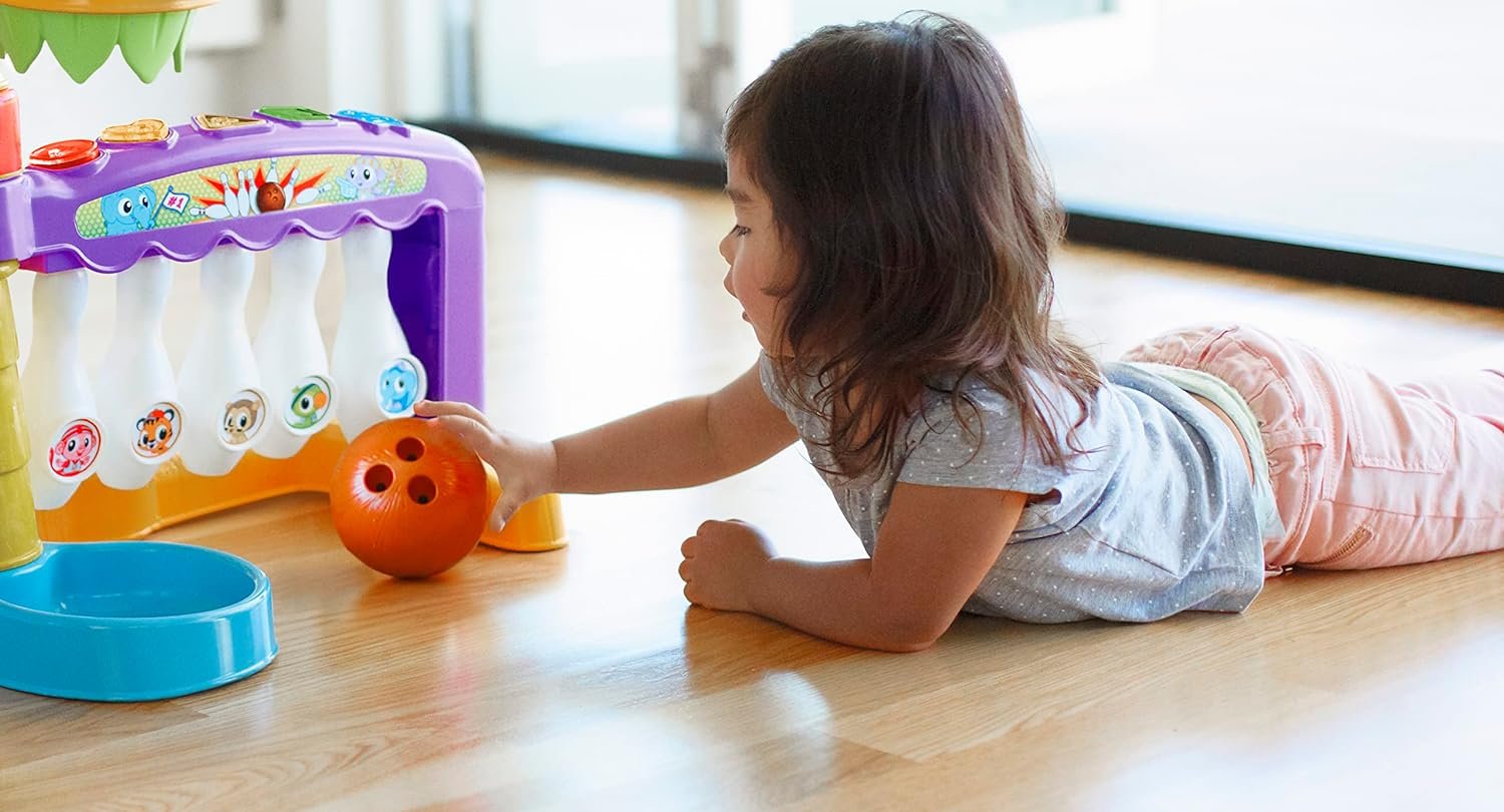 Triplique a brincadeira com 3 esportes: basquete, futebol e boliche. Os pinos do boliche tem na base de apoio forma e cores diversas.