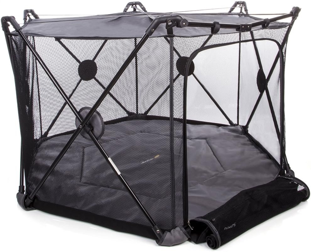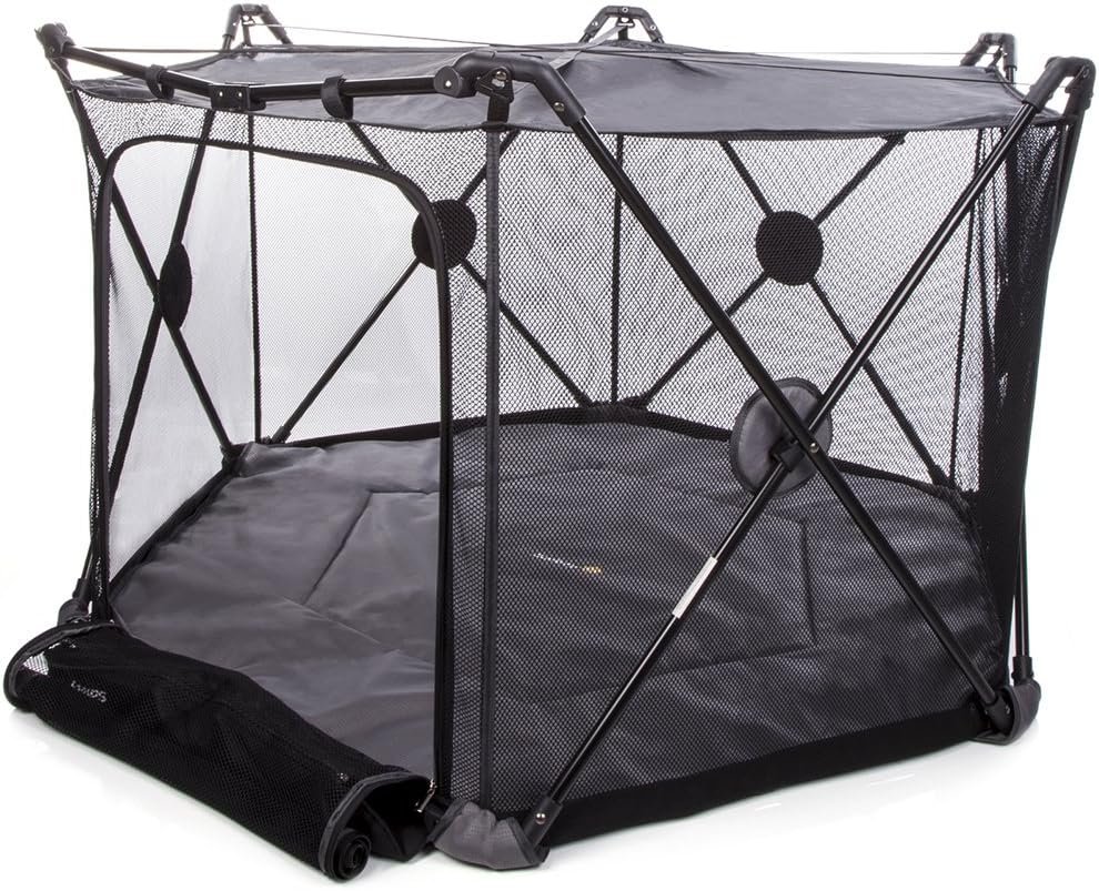 Cercado multifuncional com design exclusivo com colchonete macio, função cercado ou toca com acesso lateral e fechamento compacto e bolsa de transporte.