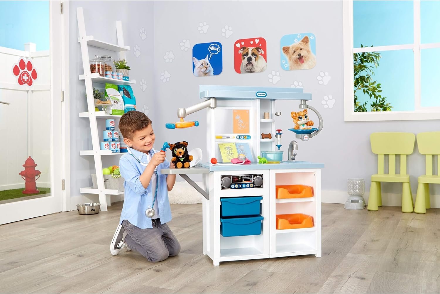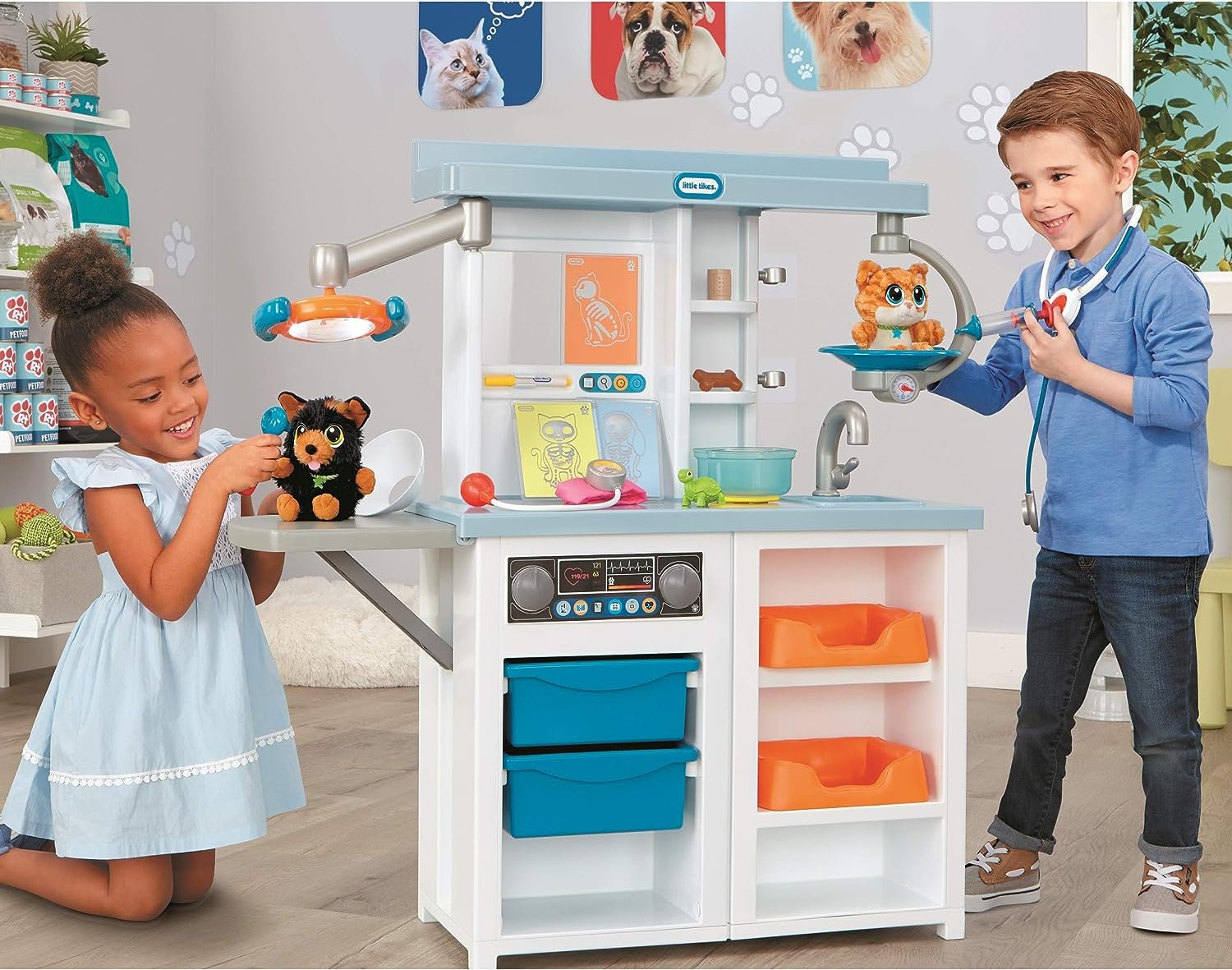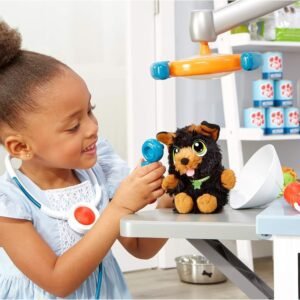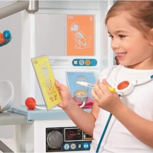 Simulação de uma clínica veterinária com recursos interativos como uma escala de trabalho, luz de exame ajustável e funcional, balcão de check-up dobrável e estação de raio x embutida com 3 laminas translúcidas que podem ser desenhadas (marcador incluído).