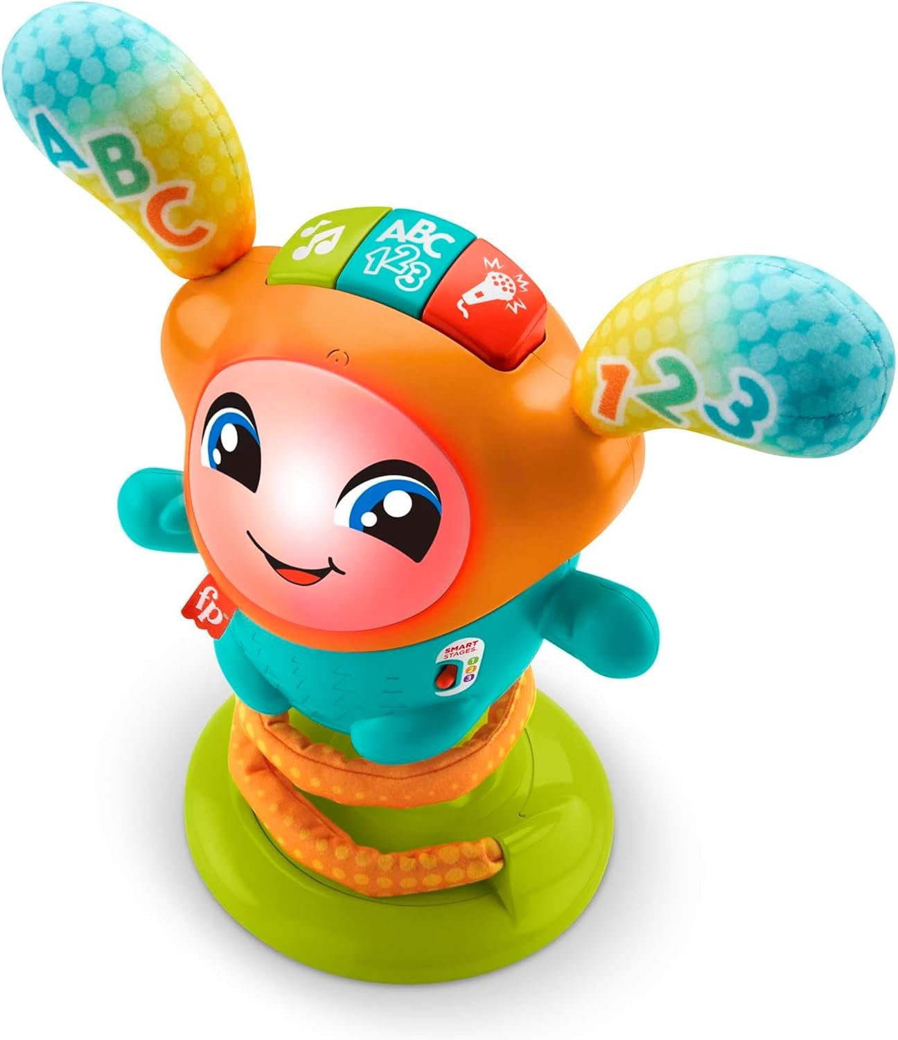 Pressione os botões de música e aprendizado para mais de 75 músicas, sons e frases, luzes multicoloridas e ação divertida de pular. Pressione o botão do microfone para gravar e reproduzir com divertidos efeitos de remix. Incentiva bebês e crianças de 9 a 36 meses a dançar, se mover e pular junto.