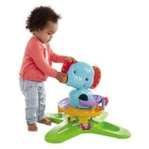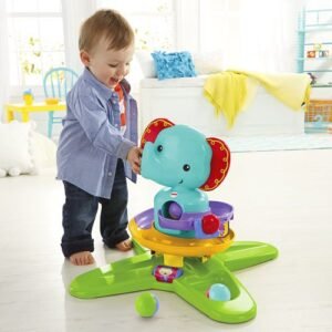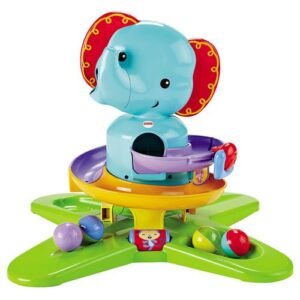 Vamos lá… experimente este divertido brinquedo musical! O bebê pode jogar uma das 4 bolas pela tromba do elefante, ouvindo músicas divertidas e observando-as descer pela rampa. Ou ele pode levar o simpático elefante para um passeio, colocando as bolas onde quiser na rampa – seguindo-as conforme saem rolando em todas as direções!