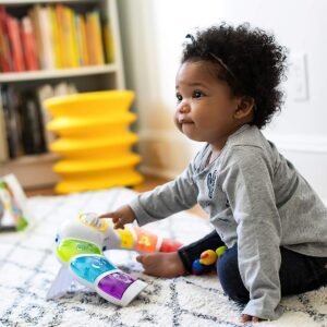 Toque o xilofone sem precisar de banquetas. O bebê pode experimentar sons de xilofone usando apenas o pressionar dos dedos ou girando o tambor de chocalho.