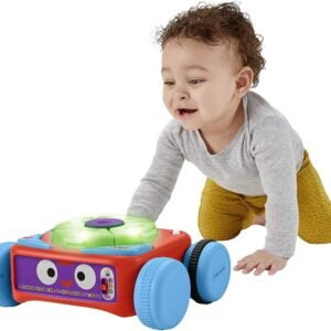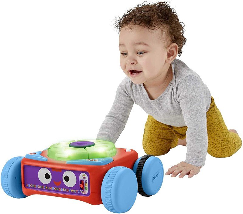 – Basta pressionar qualquer botão no robô motorizado e ele rola com música e luzes e incentiva o bebê a engatinhar para trás.