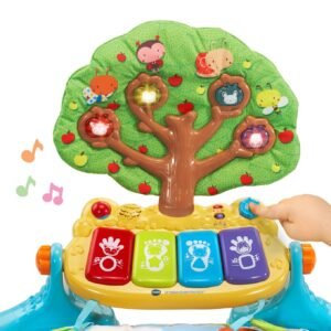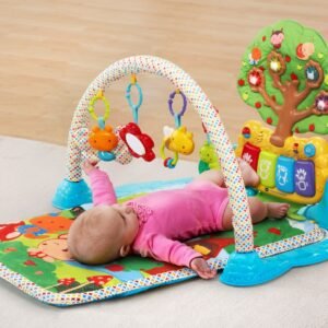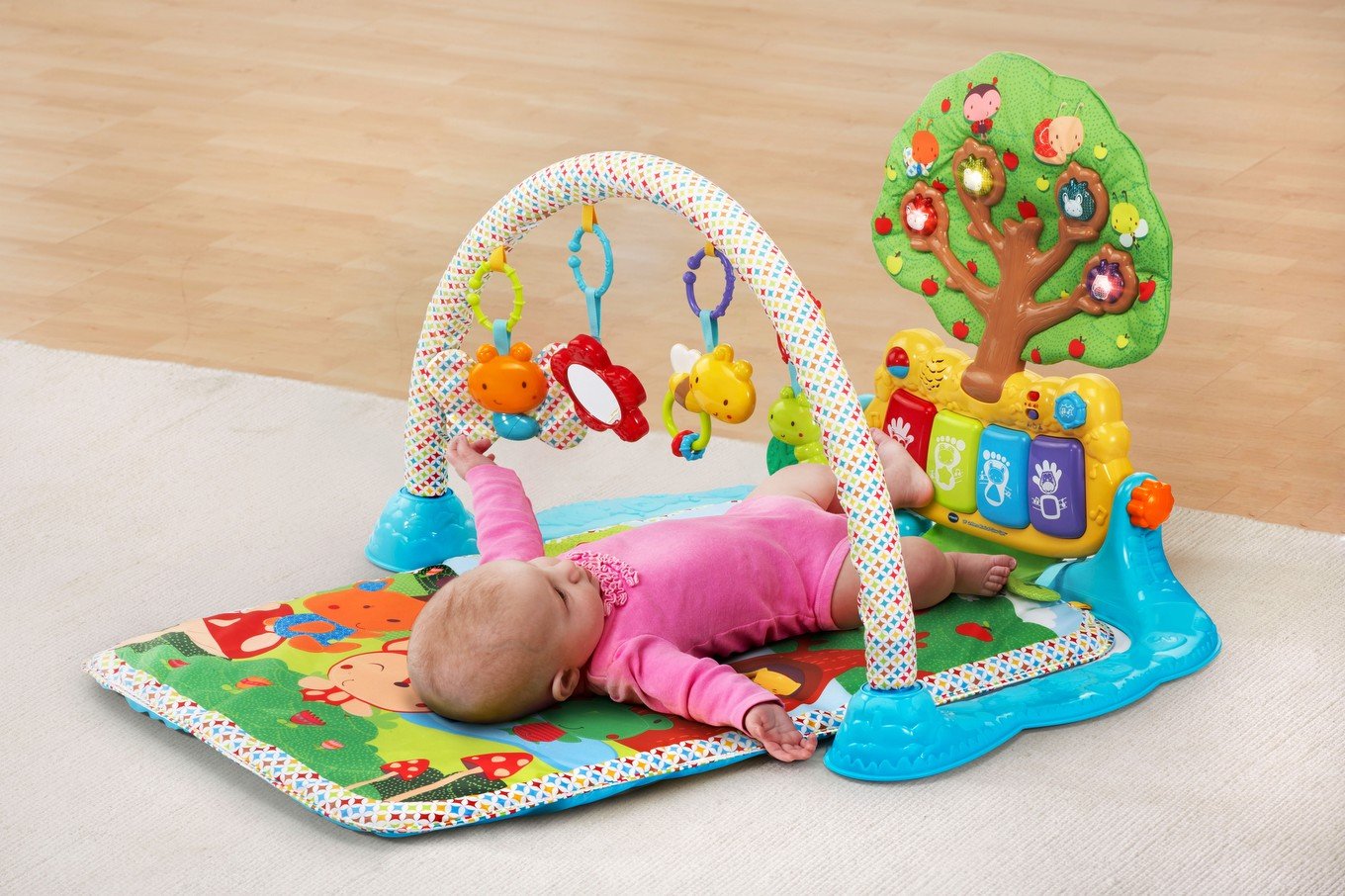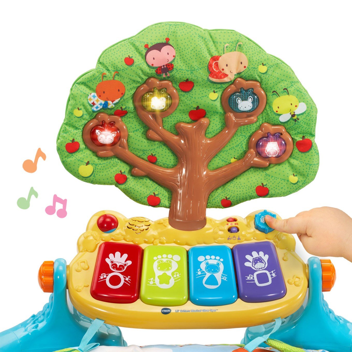 – O painel de atividades colorido apresenta teclas de piano e ajusta-se desde explorar de costas até brincar de barriga para baixo, sentar e brincar