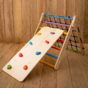 O Triângulo é inspirado na metodologia Pikler, que foi desenvolvida pela pediatra Húngara Emmi Pikler e ajuda a trabalhar o equilíbrio e a motricidade para subir, descer, girar, escalar, etc.